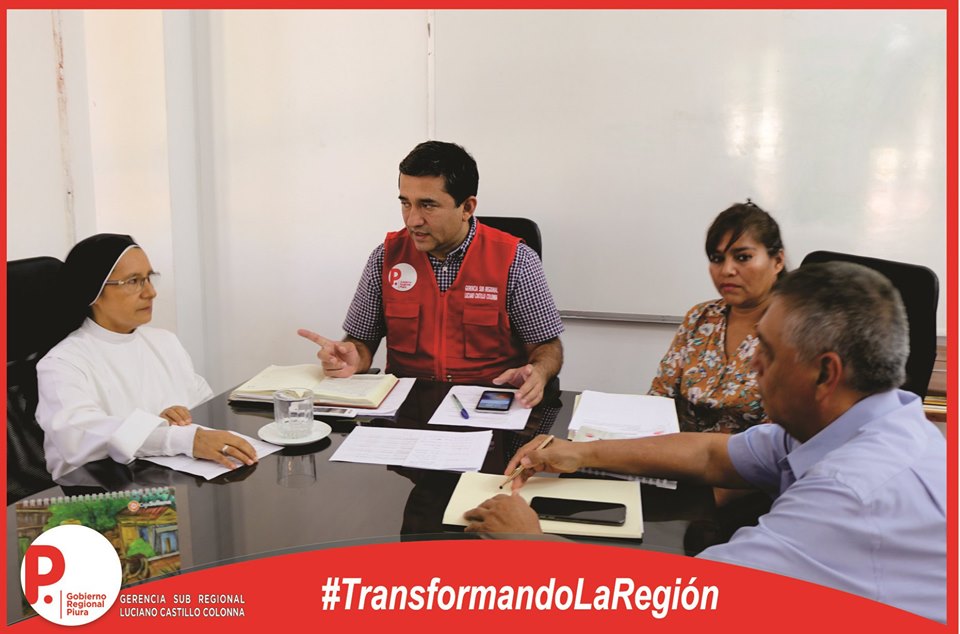 Por disposición del Gobernador Regional, Servando García Correa, el día de hoy se llevó a cabo una reunión de coordinación entre el Titular de la Gerencia Sub Regional Luciano Castillo Colonna, Ing. Fernando Ruidias y la Reverenda Madre, Teresa Díaz Díaz, Directora de la I.E Las Capullanas, para concretar la puesta en marcha de la evaluación de la infraestructura de este emblemático Colegio de Sullana, la misma que a la fecha se encuentra deteriorada, por lo que urge la inmediata intervención del estado.